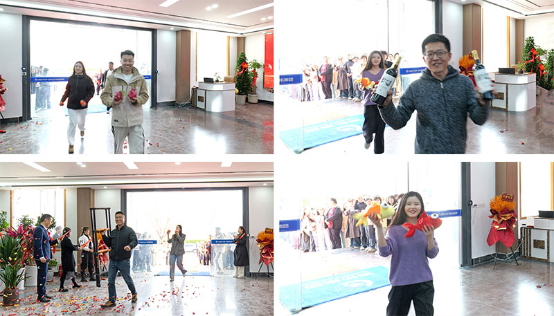 在眾人的期待中,員工代表們手捧寓意美好的物品,邁著整齊的步伐走進新辦公大樓。手持現(xiàn)金的員工,寄托著海拓集團財源滾滾的美好愿景;扛著梯子的員工,祝福公司步步高升;拿著柿子茶罐和兩瓶酒,寓意事事如意、長長久久;捧著蘋果的員工,祈愿公司平安順遂;拿著火龍果的員工,象征著事業(yè)紅紅火火;玩具魚和花餑餑,則寓意著年年有余、生活富足。員工們臉上洋溢著自信幸福的笑容,對海拓的未來充滿期待,也為典禮增添了一抹溫馨而熱烈的色彩。