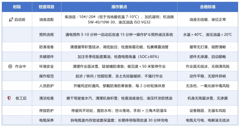 做好設(shè)備 “防凍預(yù)熱” 是關(guān)鍵低溫易導(dǎo)致油液凝滯、電瓶虧電,需優(yōu)先完成三項(xiàng)準(zhǔn)備:一是更換適配油液,柴油需選用比當(dāng)?shù)氐蜏氐?7-10℃的抗凝型號(如 - 10#/-20#),同時(shí)添加抗凝劑;液壓油、機(jī)油換為冬季低黏度專用款,冷卻液更換為 - 30℃以下防凍型。二是規(guī)范預(yù)熱流程,先通電預(yù)熱 5-10 分鐘,啟動(dòng)后怠速運(yùn)轉(zhuǎn) 15 分鐘,待水溫超 40℃、液壓油溫超 20℃再操作,露天設(shè)備可加裝燃油預(yù)熱器提升啟動(dòng)效率。三是細(xì)節(jié)檢查,清理履帶 / 輪胎積雪結(jié)冰,調(diào)低胎壓增加接地面積,包裹裸露油管,確保暖風(fēng)、除霜功能正常。